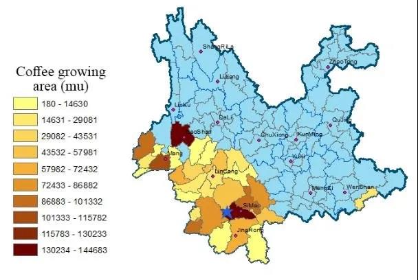 云南咖啡的种植产区主要分布在云南省的西南部:临沧、保山、普洱、德宏。