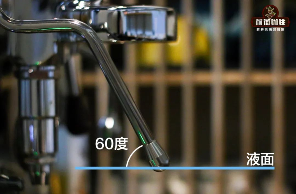 学会制造漩涡后,就来到下一步了。前街看到有些朋友会制造漩涡了,但是打出来的奶泡还是很粗糙。原因就是它制造的漩涡是在奶泡层下面的,也就是暗涌。我们在打绵的时候,是要把蒸汽孔挪到奶泡层才会起到打绵的作用。有朋友就会反映,“我再往上挪一下就会出现滋滋滋的声音了,奶泡又会增加了。”这就说明的你的蒸汽棒角度太小了,一般不建议小于45度角。