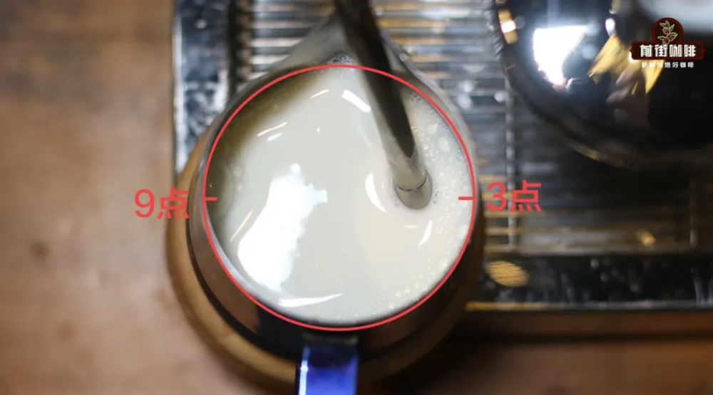 第二点是尽可能地做出更大的液面,液面越大。奶泡一定量的情况下,液面越大,奶泡层就越薄,这个很好理解吧,还有另一个作用是大液面更容易形成漩涡。所以你会看到一些咖啡师打发奶泡时会把奶缸倾斜,就是为了更好地形成漩涡。不过,这个也不是必须的,如果你有条件的话,可以先用水来练习制造漩涡,多换下角度,找到制造漩涡的那个位置,基本上离打发细腻奶泡的终点不远了。